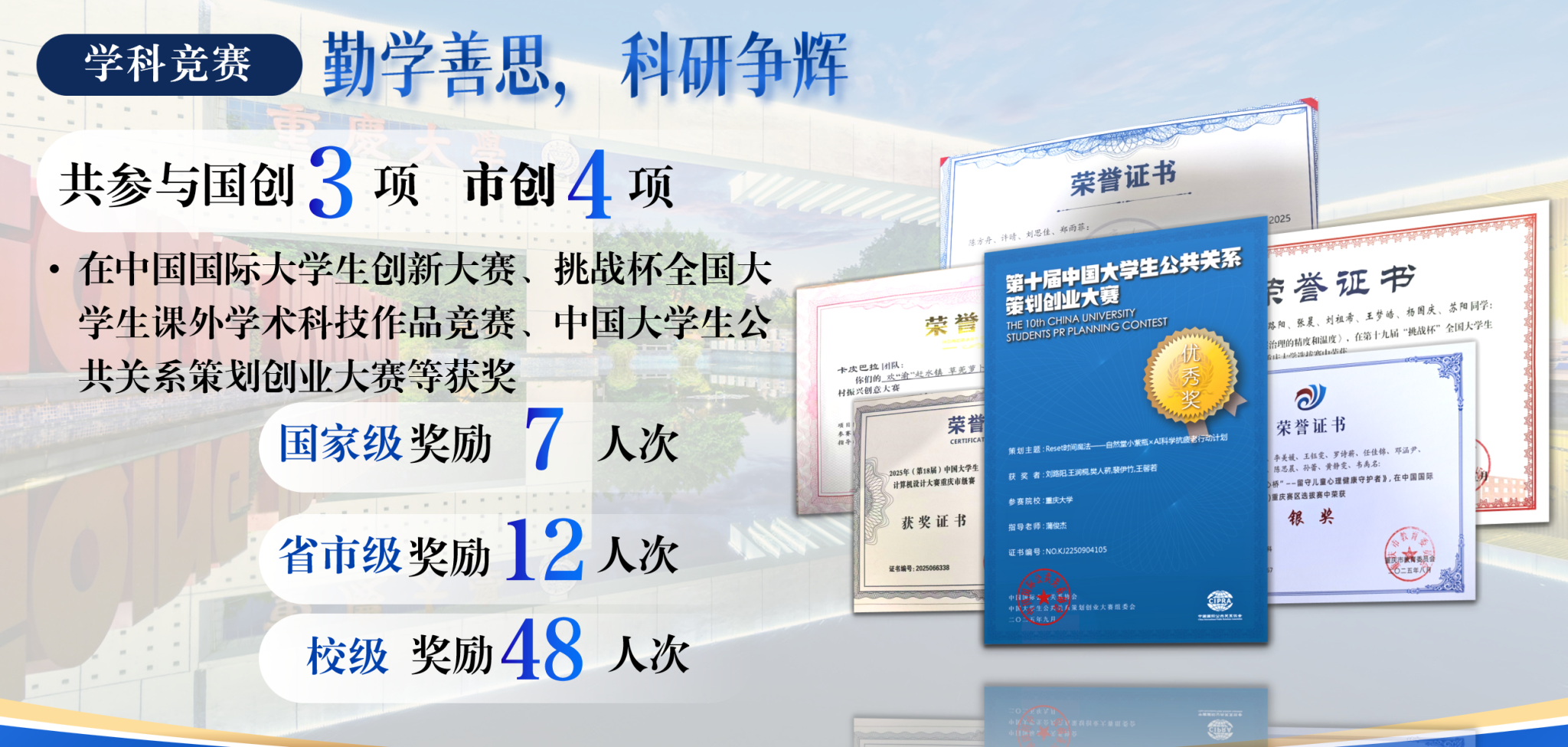 科研竞赛场上,他们同样不甘人后。班级成员积极参与3项国家级、4项市级大学生创新创业训练计划项目,以及15项SRTP项目。在中国国际大学生创新大赛、“挑战杯”全国大学生课外学术科技作品竞赛、中国大学生公共关系策划创业大赛等高水平学科竞赛中斩获佳绩,累计获得国家级奖励7人次、省市级奖励12人次、校级奖励48人次。这些数字背后,是同学们将理论知识与创新思维深度融合的积极探索。