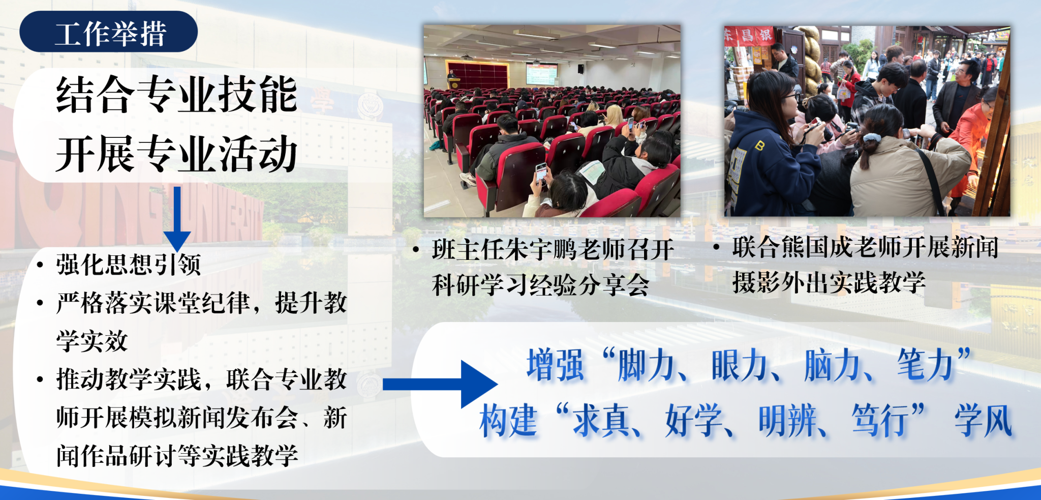 班级文化是凝聚人心的精神纽带。班级积极构建“专业务实、团结奋进、勇于担当”的文化氛围,注重推动马克思主义新闻观教育与专业实践深度融合,引导同学们自觉承担起“举旗帜、聚民心、育新人、兴文化、展形象”的使命任务,将个人成长融入党和国家新闻事业的大局。