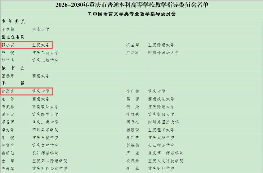 近日,重庆市教育委员会公布了2026-2030年普通本科高等学校教学指导委员会委员名单。第一影视