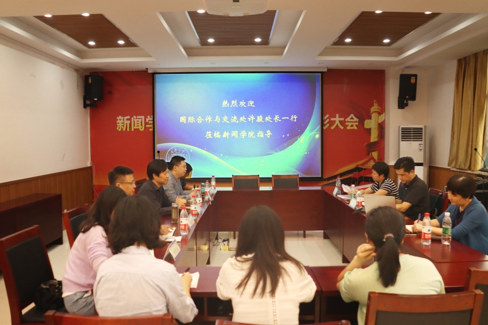 当前的国际联合培养工作进行整体性介绍,他指出,学院目前着力于硕士双学位人才培养,并将逐步推进联合研究机构建设。就国际合作下的学科建设问题,他以人才引进为例,提出当前联合培养进程中“既有发展机遇,又有现实困难。”董天策具体分析原因,并同国际合作与交流处交换意见,寻求突围路径,从政策完善、思想动员与对外宣传等方面提出针对性举措。