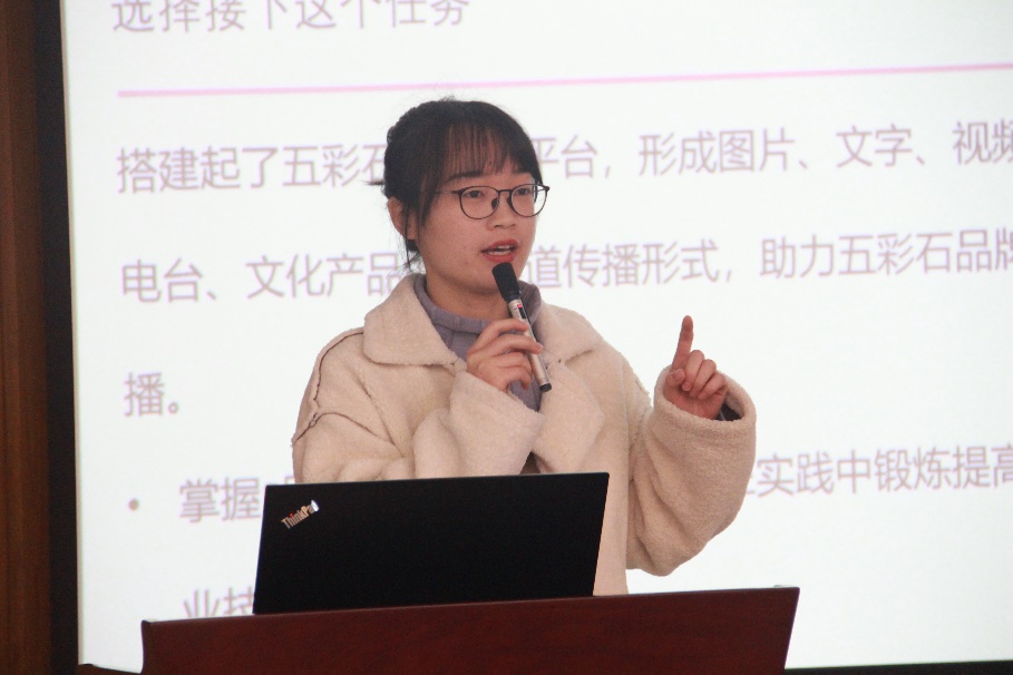 吴小玉以“志之所趋,无远弗界”为题作了有关学生工作的发言。她主要就“继续做学生工作有没有意义?”、“怎样平衡学习和学生工作?”两个问题给出说明和建议。在她看来,学生工作是否有意义在于你是否认同该组织、团体的核心理念,是否真正热爱这个工作。吴小玉以在五彩石协会的宣传工作为例,阐释了做好学生工作是追求双赢的过程,她在助力五彩石协会发展壮大的同时提高了自身的阅历与专业实践能力,并且扩大了交际圈,收获珍贵友谊,实现了学生工作的意义。对于如何平衡学习和学生工作,她认为现阶段大家应该以学习为首要任务,尤其要重视课堂的作用,像海绵一样吸收知识,国际传播、媒介经营管理、数字媒体产业等课程的学习具有专业性和针对性,能帮助我们明晰新闻传播学的学术流派、规范和学习方法,锻炼提高学术能力。