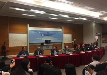10月23日下午,香港浸会大学传理学院第8届“普利策新闻奖得主”工作坊开幕,八位受邀普利策奖得主、浸会大学教务长Clayton MACKENZIE教授、浸会大学传理学院院长黄煜教授、传理学院高级讲师李文、传理学院助理教授闾丘露薇出席开幕式。