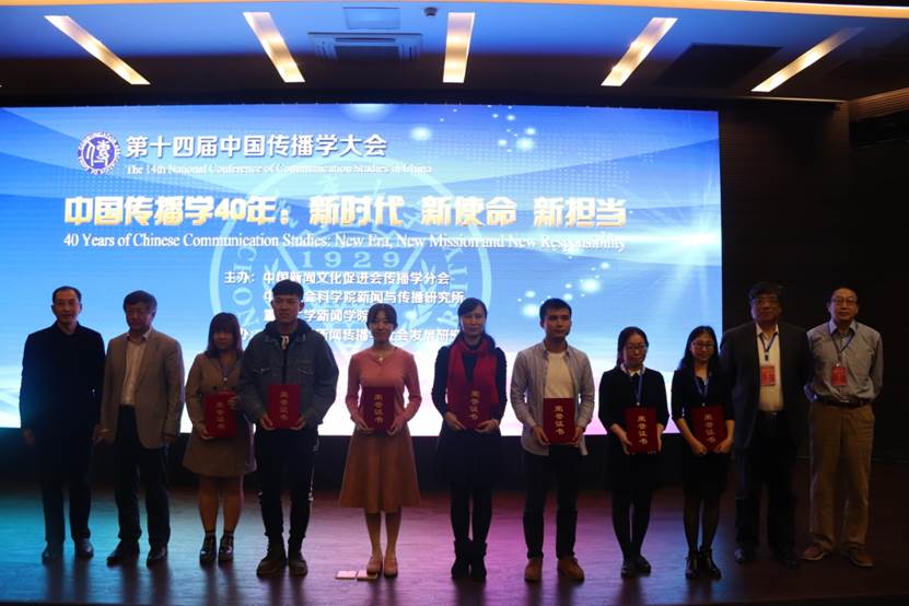 主题演讲结束,中国社会科学院新闻与传播研究所所长、中国传播学会会长唐绪军研究员宣读了“第六届全国新闻传播学优秀论文遴选结果”。10篇论文从2017年全国12139篇新闻传播学论文之中脱颖而出,荣获年度优秀论文。中国传播学会副会长、河北大学新闻与传播学院原院长白贵教授,中国传播学会副会长、天津师范大学新闻传播学院原院长刘卫东教授为获奖论文作者代表颁发了荣誉证书。