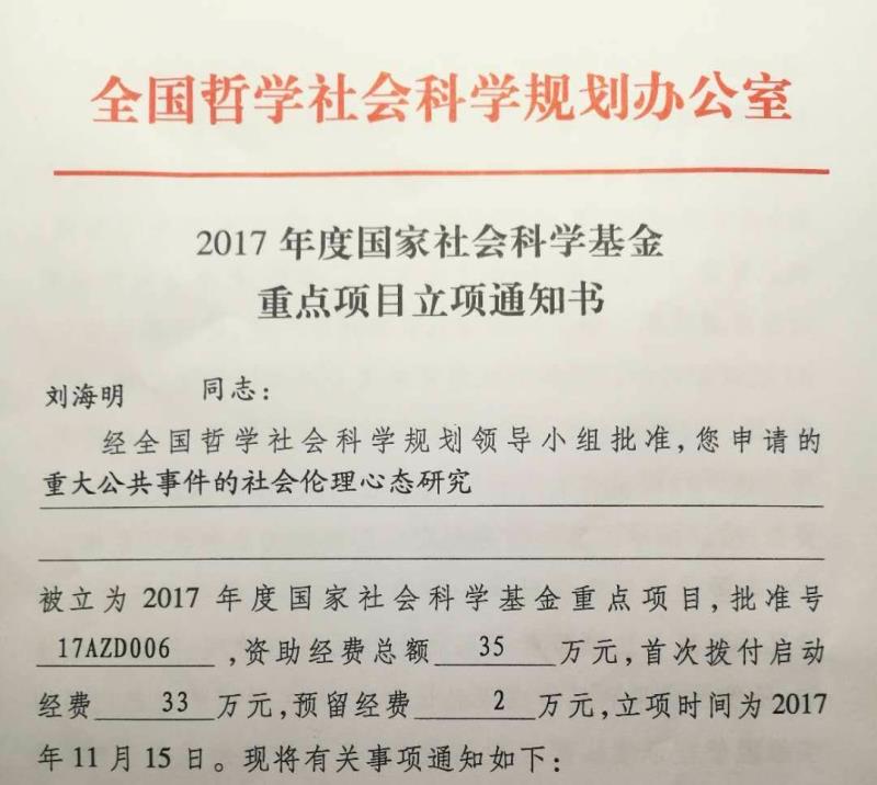 刘海明教授申请的《重大公共事件的社会伦理心态研究》获批2017年度国家社科基金重点项目。