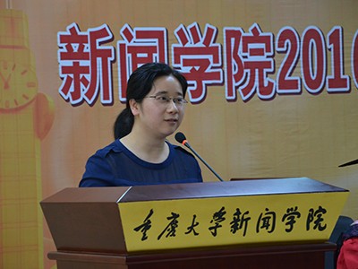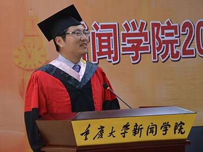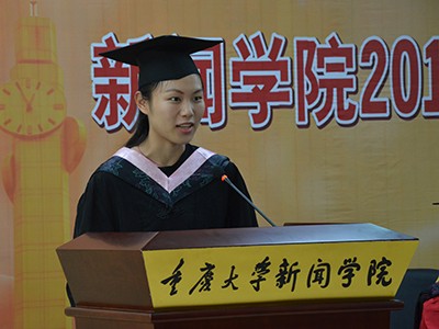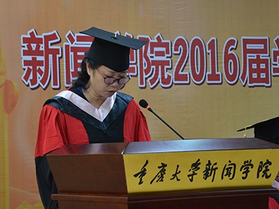 毕业生代表,2016届本科新闻专业二班万凌云在典礼上发言。万凌云同学首先表达了对学院老师和父母的感谢,细数了在重大四年的所思所感。万凌云希望大家以重大人为骄傲,走出校门后依然保持学习的热情和理想的坚定。
