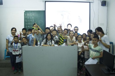 在开始进行第一个环节“寓言小游戏之拼成语”时,有些小孩子已经按捺不住,高高举起了自己的小手,在主持人和其他志愿者的组织下,最后确定六个小孩子参加游戏。他们两两一队,组成了黄队、蓝队以及橙队。孩子们远远比我们想象中要懂得更多,每只队伍都在规定时间内完成,只有蓝队把“亡羊补牢”拼错,另外两只队伍都全部正确,而黄队用时最短。当黄队的两个女孩子带着灿烂的笑容领取到游戏奖品时,个子小的女生轻轻拍了拍自己的胸脯说:“我和她是好朋友,我们很默契。”小游戏的欢乐也褪去了孩子们的生分与羞涩,让整个课堂都活跃起来。