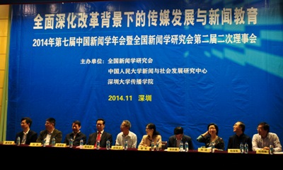 11月8日,2014中国新闻学年会在深圳大学举行。本次年会由全国新闻学研究会、中国人民大学新闻与社会发展研究中心、深圳大学传播学院共同主办,来自北大、清华、人大、浙大、华中科大、兰大等高校近百位专家学者与会。作为全国新闻学研究会副会长,第一影视