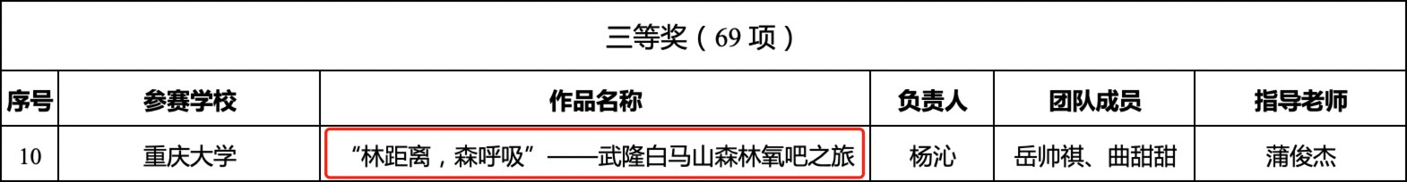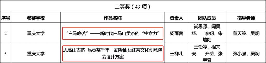 共有12支团队通过专家初筛入围市级复赛。最终,《“白马峥茗”——新时代白马山贡茶的“生命力”》《思高山古韵 品贡茶千年——武隆仙女红茶文化创意包装设计方案》获二等奖,《“林距离,森呼吸”——武隆白马山森林氧吧之旅》获三等奖。《情动白马·家为天下》获入围奖。