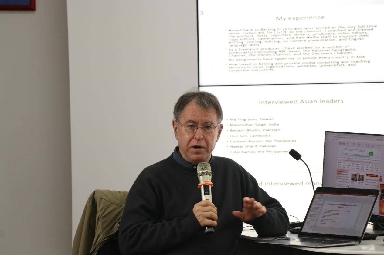 国际传播课程工作坊《广播电视新闻的制作与播报》(Introduction to Broadcast Journalism)在学院融媒体中心举行。本次工作坊由央视国际频道高级顾问、ABC电视台前驻北京站长雅各布·哈塞尔科恩(Jake Haselkorn)受邀讲授。