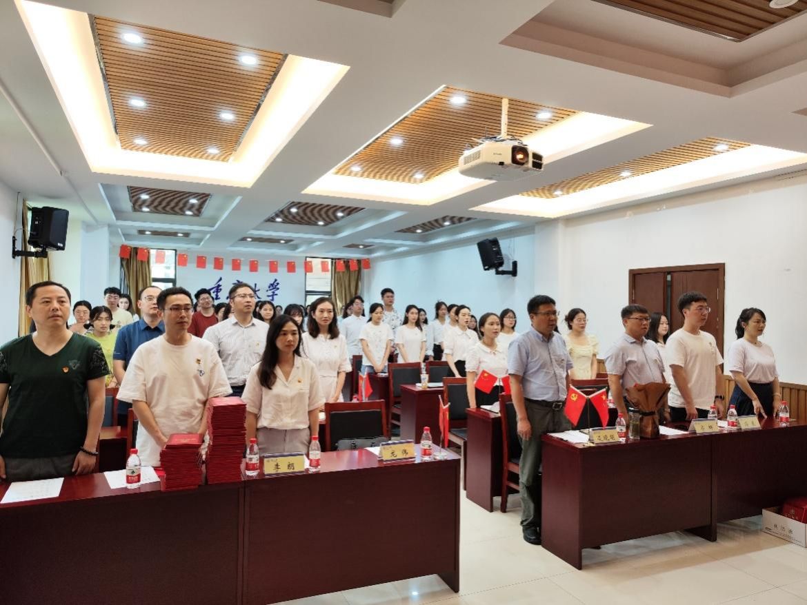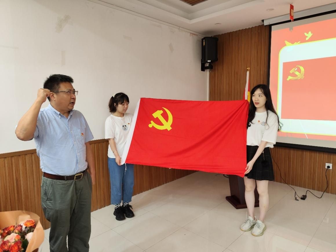 与会党员全体起立并奏唱《国歌》后,在领誓人凌晓明的带领下,新入党党员面对党旗庄严宣誓,与会全体党员共同重温入党誓词。