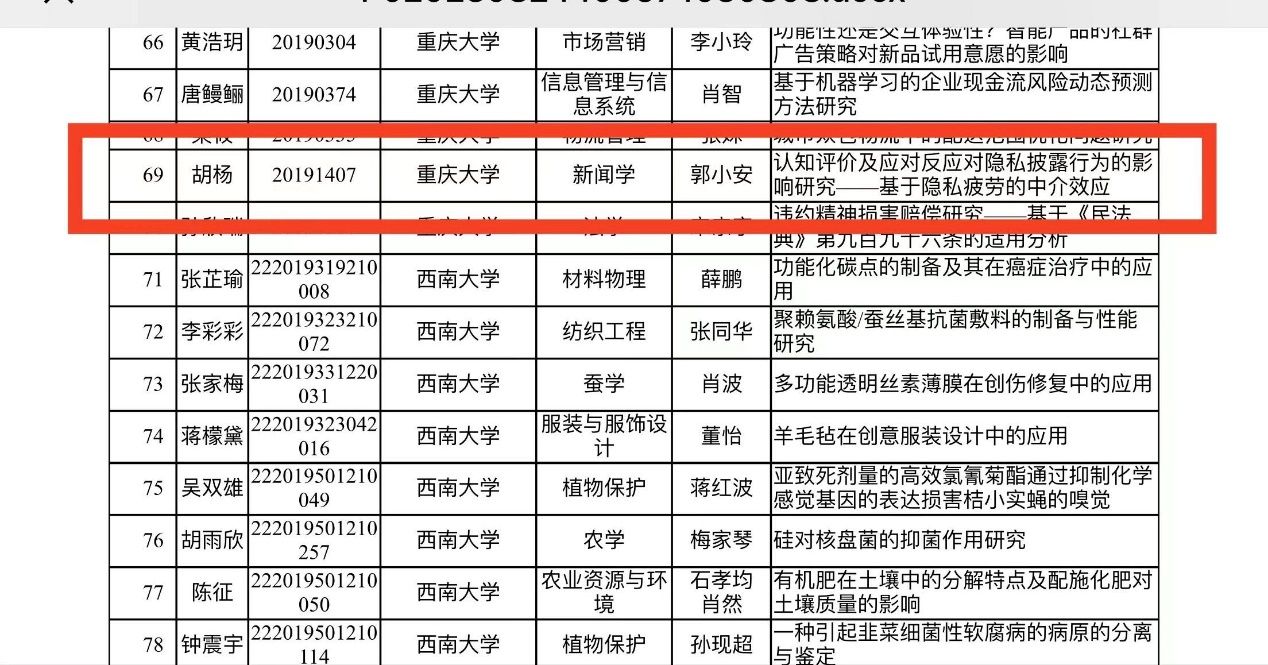 2023届本科生胡杨同学榜上有名,论文指导老师为郭小安教授。