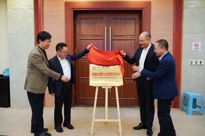 弘深学者、研究中心主任曾润喜共同为“智能传播与治理研究中心”揭牌。董天策宣读了研究中心成立文件。