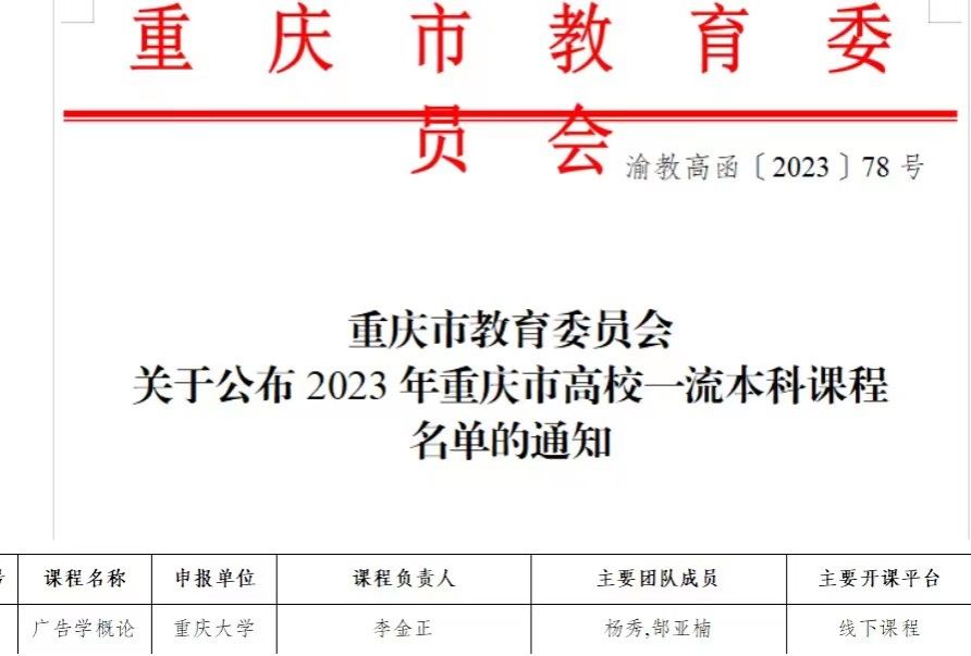 《广告学概论》课程成功入选重庆市高校一流本科线下课程。