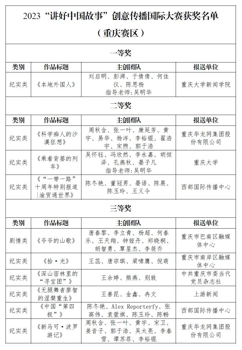 近日,由中国外文局主办,当代中国与世界研究院、中国互联网第一影视(中国网)承办的2023“讲好中国故事”创意传播国际大赛获奖作品名单正式出炉。本届大赛共评选出获奖作品98件,重庆赛区共10部作品上榜,分别获得一等奖、二等奖、三等奖。