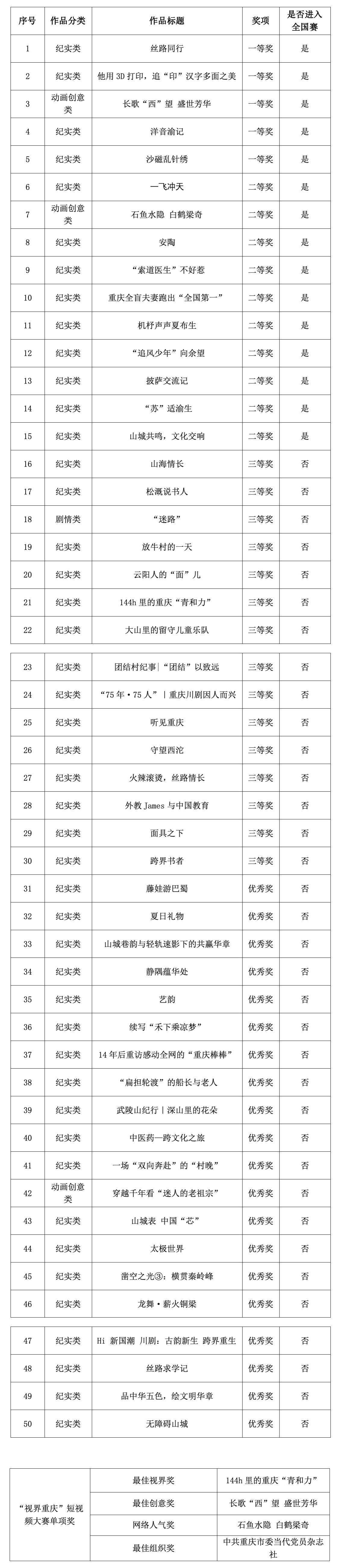 2024“讲好中国故事”创意传播国际大赛重庆分站赛暨“视界重庆”短视频创意大赛自启动以来,得到了全市各区县有关部门、高校和社会各界的大力支持,通过个人参赛、单位参赛、媒体参赛等方式征集作品134部。经过专家初评和现场定评等环节,共评选出一等奖作品5部、二等奖作品10部、三等奖作品15部、优秀奖作品20部,最佳视界奖、最佳创意奖、网络人气奖各1部,以及最佳组织奖1项,并从中推选一、二等奖15部作品参加全国赛。现将获奖名单公示如下: