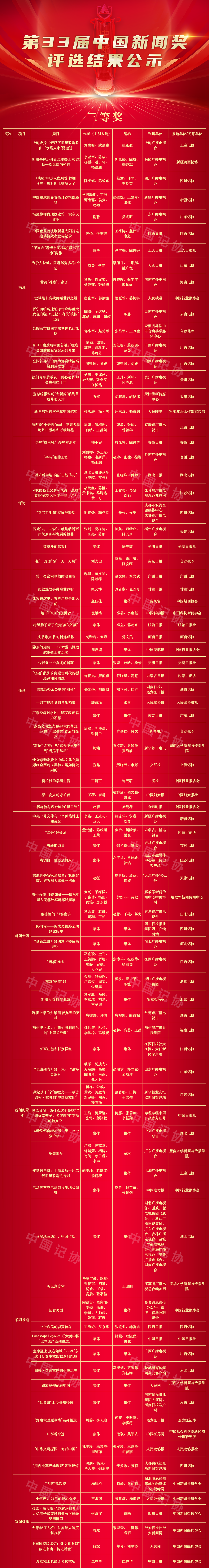 由中华全国新闻工作者协会(简称“中国记协”)主办的第33届中国新闻奖评选结果自今日起在中国记协微信公众号、中国记协网公示。本届拟获奖作品378件,其中特别奖3件、一等奖74件、二等奖114件、三等奖187件。
