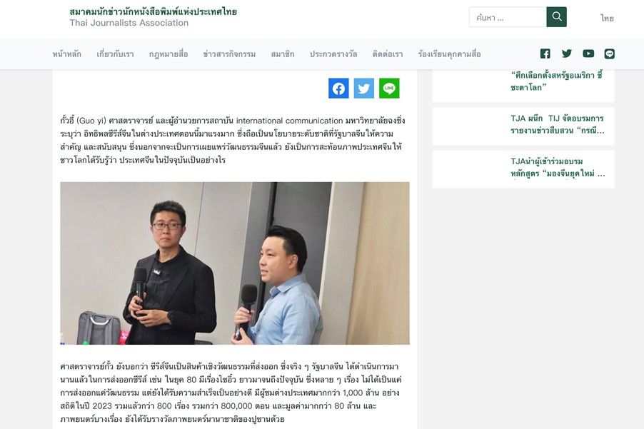 据泰国记者协会和泰国国家电视台公开报道,郭毅在专访中指出:自20世纪80年代末经典之作《西游记》“出海”开创中国国产影视剧国际传播先河以来,近40年间中国国产影视剧在海外市场的影响力日益提升。这是国家层面高度重视和支持结果,其目的不仅仅是向世界传播中国文化,还旨在与世界分享中国式现代化经验和新时代中国日常生活的新面貌。在国家政策、地方扶持、民营企业三方合力下,中国国产影视剧得以在全球180个国家和地区发行,出口贸易总额超8000万美元,成为中国视听节目国际贸易中的主要产品。近年来,由腾讯WeTV等中国民营企业在海外创作生产的50余部“本地化”电视剧不仅深受国外观众喜爱,更成为中国与泰国等东盟国家文化交流的媒介。