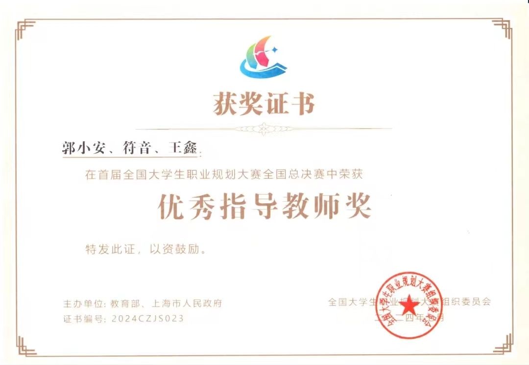 郭小安教授和王鑫老师荣获首届全国大学生职业规划大赛全国总决赛优秀指导教师。