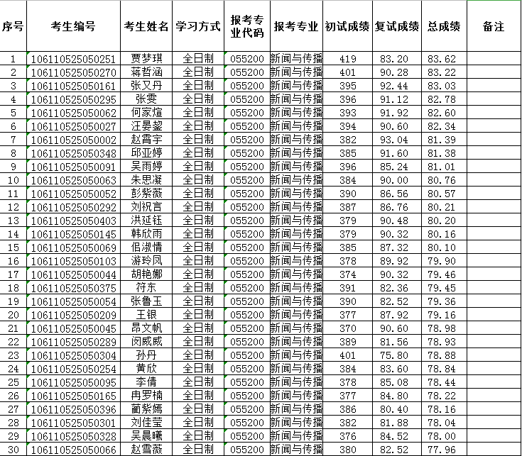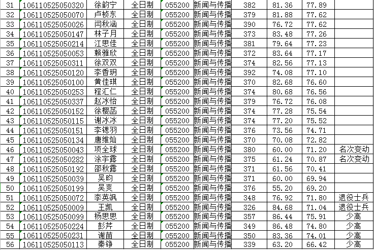 复试一志愿考生共有56名,目前学校下达录取名额如下:新闻与传播(专业学位)招生名额61名(其中已录取推免生15名),复试成绩及总成绩公示如下: