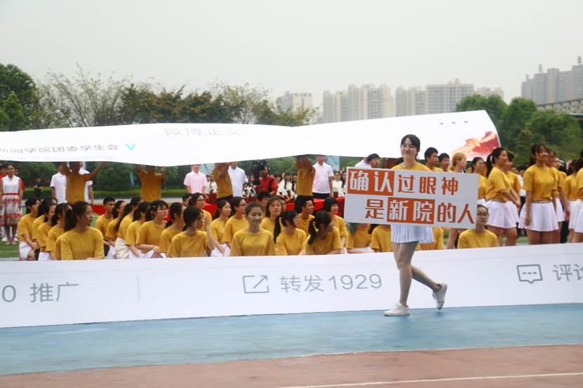 着一袭黄衣,背后的小猫图案显青春俏皮,新闻学子昂首挺胸,步履沉稳,踩着音乐节拍,缓缓进场。站定,转身,下蹲,微博框就位,一系列准备工作有条不紊。随着音乐《阳明山》的响起,同学们在四个领舞的带领下开始了他们的表演,节奏虽快,却忙而不乱。期间,“确认过眼神,是新院的人”、“铁肩道义,重大文章”的弹幕由同学举着从框前经过,更有着巨型二维码展开供扫描,新院气息浓厚。